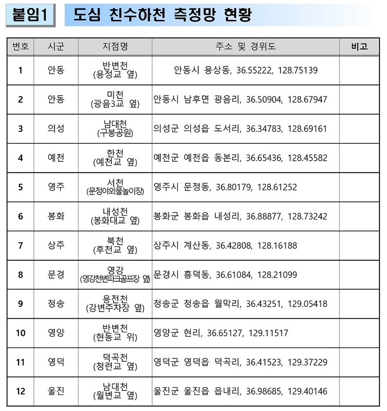 - 주민 이용 및 농업 활용 가능성 확인... 2026년에도 지속 운영 - [경북 세계타임즈=한윤석 기자] 경북도 보건환경연구원 북부지원은 북부권 도심 친수하천의 수질 안전성 확보를 위해 ‘도심 친수 하천 측정망 사업’을 추진한 결과, 조사 대상 12개 지점 모두 1등급 ‘좋음’ 수준의 수질을 유지한 것으로 확인됐다.