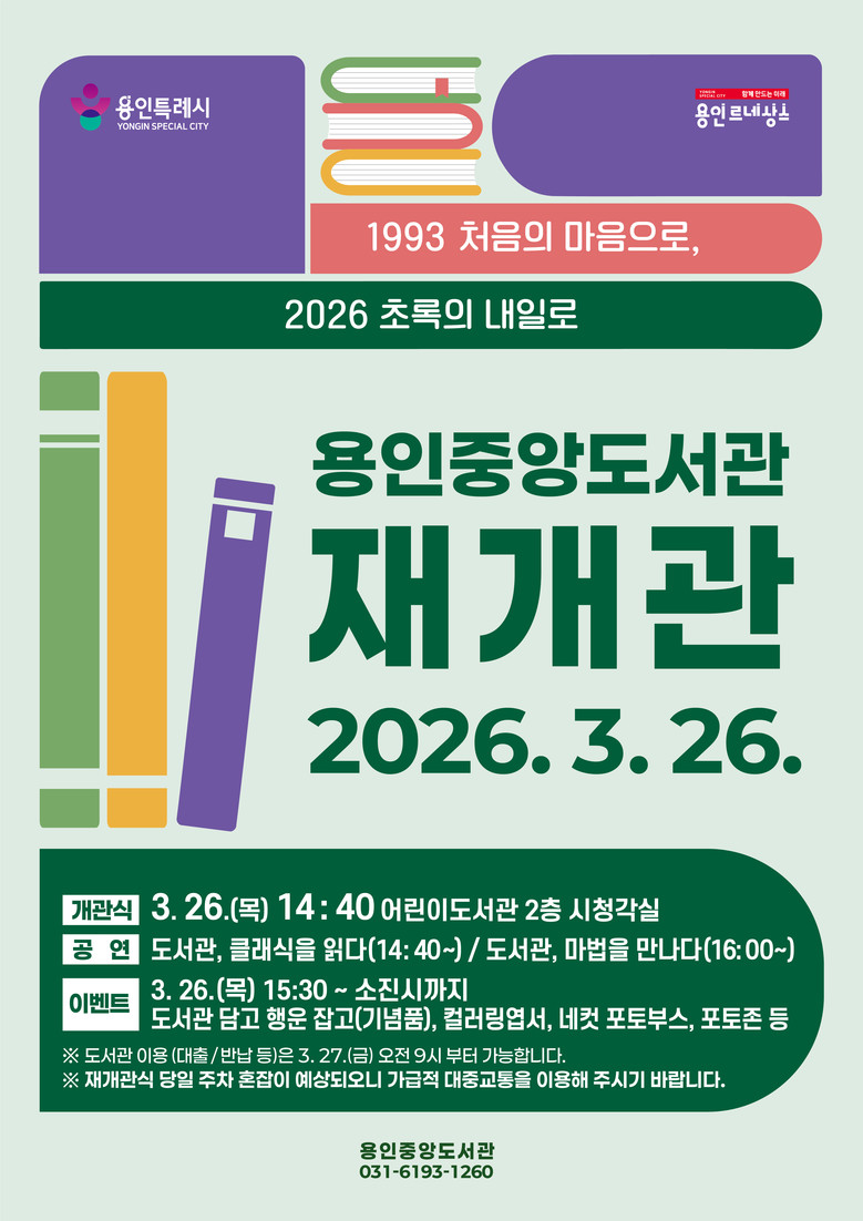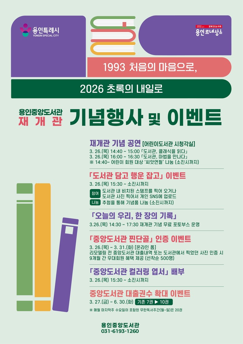 시 관계자는 “무료 네컷 포토부스, 중앙도서관 찐단골 인증 이벤트, SNS 프레임 포토존 운영, 컬러링 엽서 배부 등 다양한 이벤트가 있으니 많은 관심과 방문을 부탁드린다”며 “도서 대출, 반납 및 시설 이용은 27일 오전 9시부터 가능하다”고 말했다.