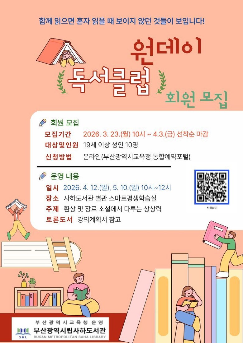 가볍게 참여하는 독서토론... 환상·장르소설로 상상력과 사유 확장 [부산 세계타임즈=이용우 기자] 부산광역시립사하도서관(관장 김정남)은 오는 4월 12일과 5월 10일 오전 10시부터 사하도서관 별관 스마트평생학습실에서 성인 10명을 대상으로 ‘원데이 독서클럽’을 운영한다.