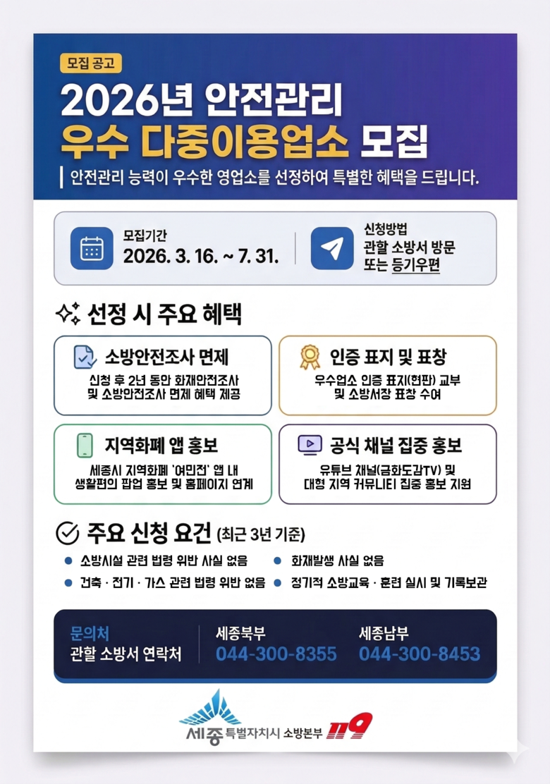 신청 희망 업주는 오는 7월 31일까지 세종북부소방서(☎044-300-8355) 또는 세종남부소방서(☎044-300-8453)를 방문하거나 등기우편으로 신청서를 제출하면 된다.