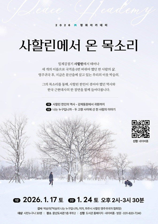 이인숙 문산도서관장은 “세 개의 이름으로 이어진 한 사람의 삶을 통해, 지역사회가 공존의 의미를 새롭게 바라보는 자리가 되길 바란다”라며 “문산도서관이 서로 다른 기억을 가진 이웃들을 잇고 소통하게 하는 평화의 공간이 되길 바란다”라고 말했다.