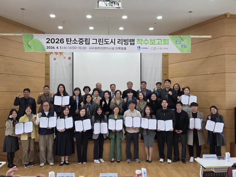 [수원시 세계타임즈=송민수 기자] 수원특례시(시장 이재준)와 수원도시재단이 1일 서수원주민편익시설에서 ‘2026년 탄소중립 그린도시 리빙랩 착수보고회’를 열고, 탄소중립 그린도시 리빙랩 사업의 추진 방향을 알렸다.