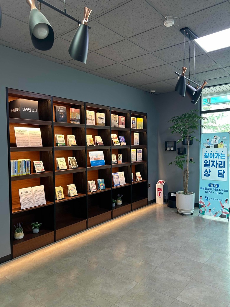 | ▲ 북수원도서관 내 ‘신중년 라운지’ 도서 전시 모습 |