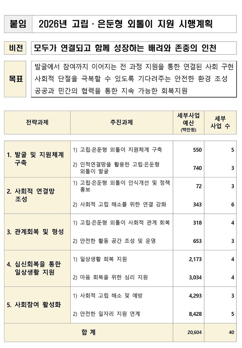 주요 내용으로는 고립·은둔형 외톨이 발굴과 사회적 고립 해소를 위해 ▲발굴 및 지원체계 구축 ▲사회적 연결망 조성 ▲관계회복 및 형성 ▲심신회복을 통한 일상생활 지원 ▲사회참여 활성화 5개 전략과제를 설정하고 10개 추진과제와 40개 세부사업을 추진한다.