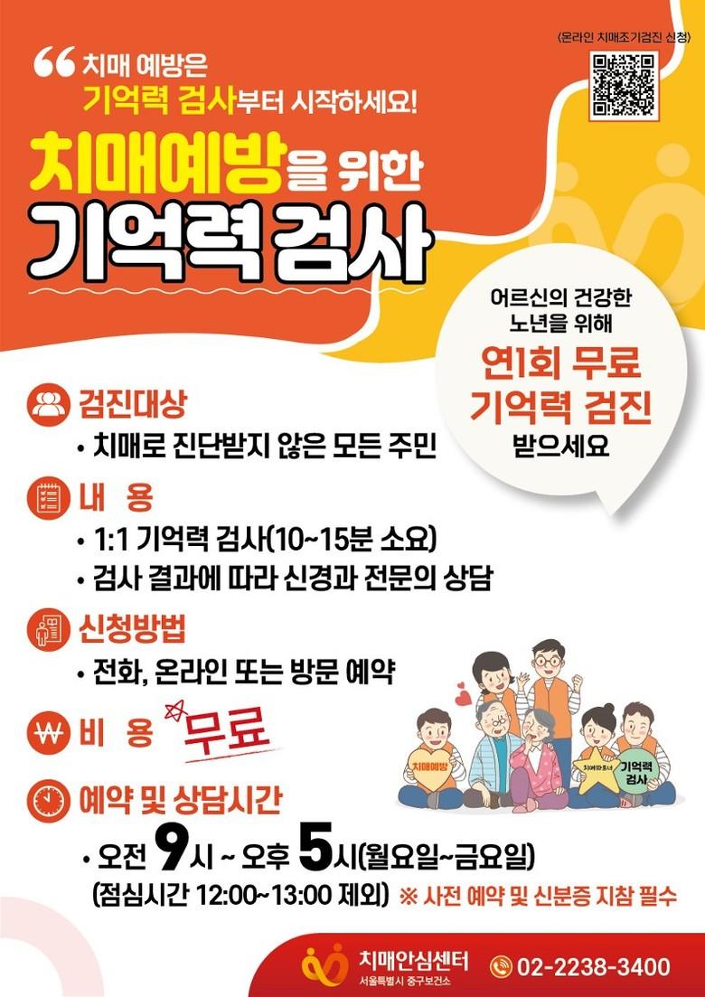 이번 검진은 거동이 불편하거나 인지 저하로 인해 보건소나 치매안심센터 방문이 어려운 어르신들에게 편의를 제공하기 위해 마련됐다. 평일 중 중구치매안심센터(02-2238-3400)로 방문하면 언제든 검사를 받을 수 있다.
