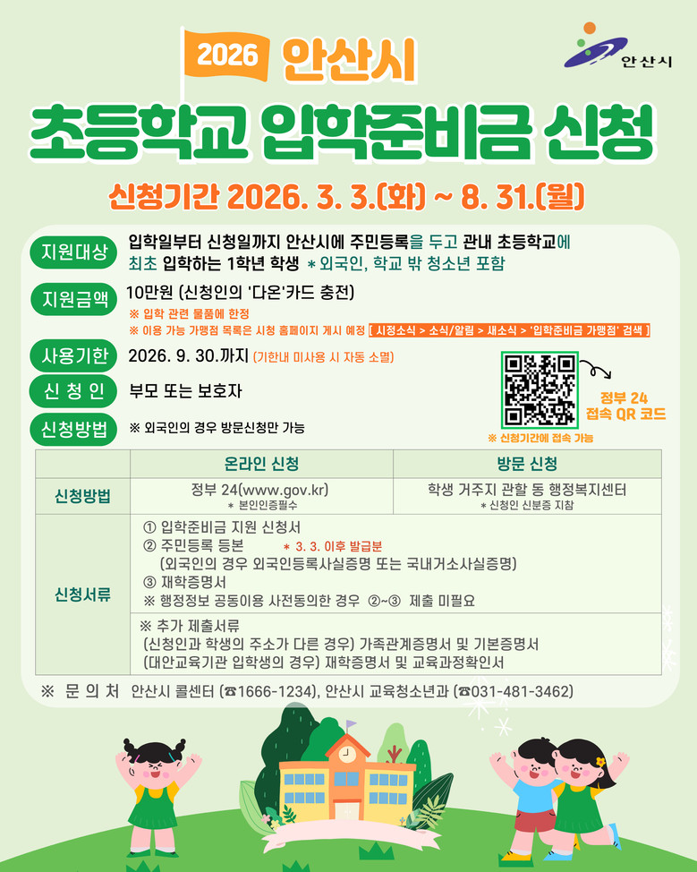 안산시는 초등학교 입학준비금 지원사업을 신규 도입해 안산시에 주민등록을 둔 초등학교 입학생에게 10만 원을 지역화폐로 지급한다. 이는 물가 상승과 교육비 부담 증가로 어려움을 겪는 학부모들을 지원하기 위한 것으로, 입학 초기 단계부터 안정적인 학업 환경을 조성하고자 하는 취지다.