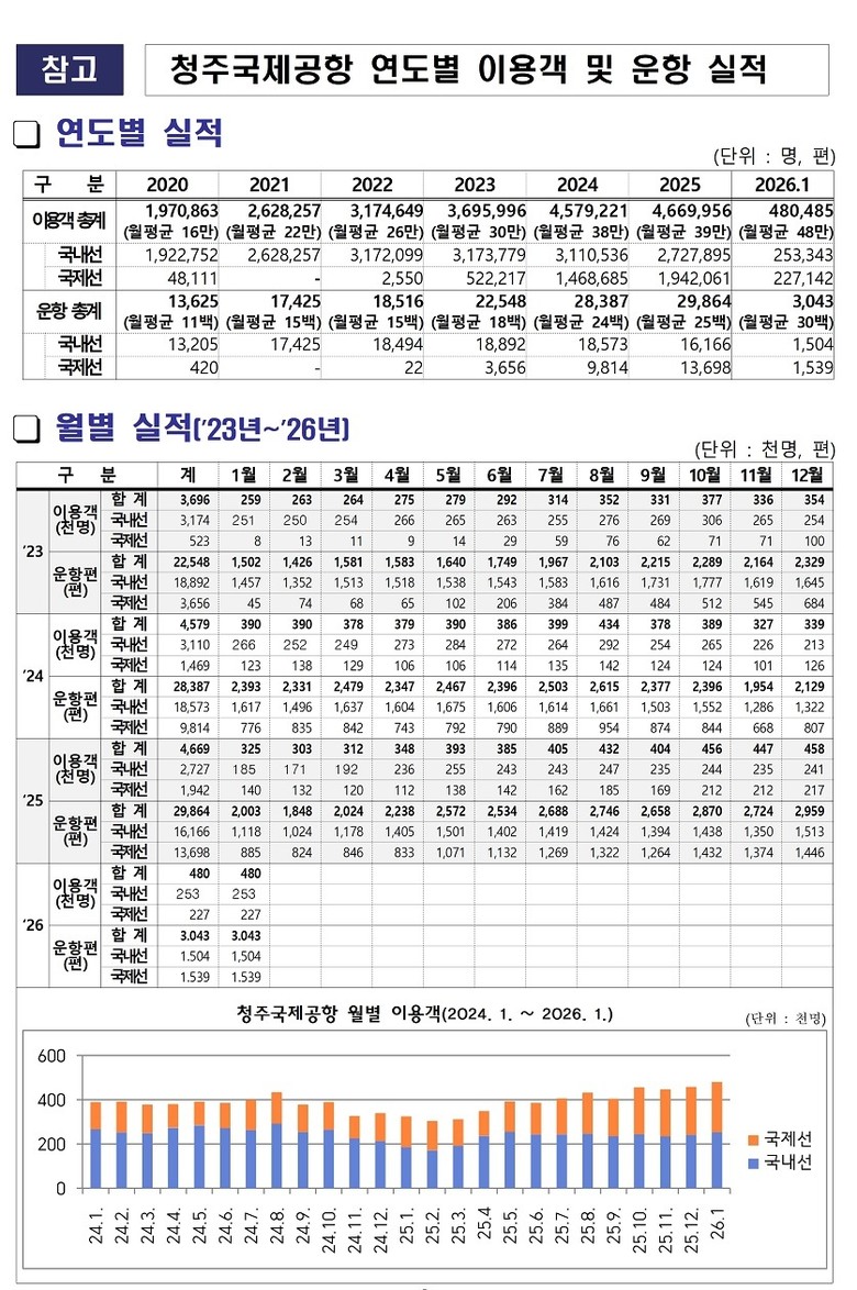 김민정 충북도 균형발전과장은 “국제선 이용객의 큰 폭 증가는 청주공항의 경쟁력과 성장 가능성을 분명히 보여주는 지표”라며 “2026년 이용객 500만 명 달성을 목표로 민간전용 활주로 건설을 추진해, 국가 균형발전은 물론 청주공항이 세계로 뻗어나가는 허브공항으로 자리매김할 수 있도록 끝까지 최선을 다하겠다”고 말했다.