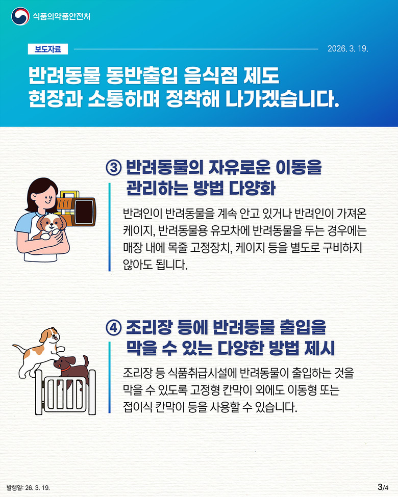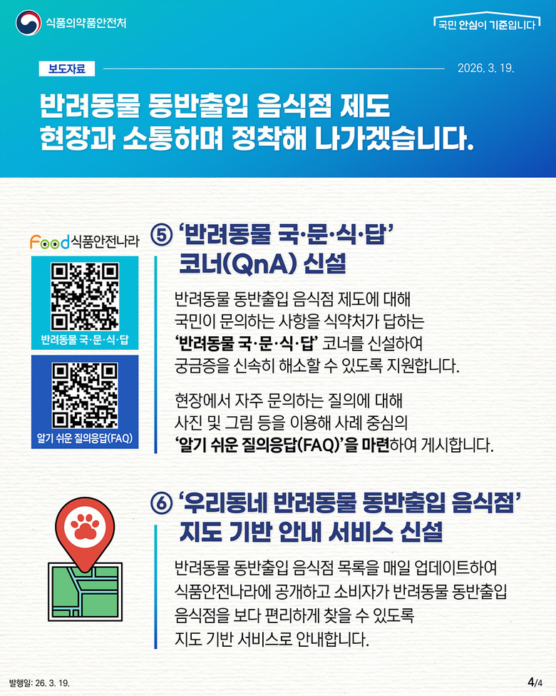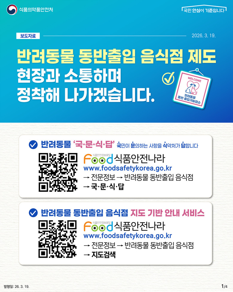 한편, 반려동물 동반 출입 음식점 현황(지도 기반 안내 서비스), 반려동물 국·문·식·답(국민이 문의하는 사항을 식약처가 답한다), 운영 매뉴얼 및 홍보자료, 질의응답 등 관련 자료는 식품안전나라 누리집(foodsafetykorea.go.kr)에서 확인할 수 있다.