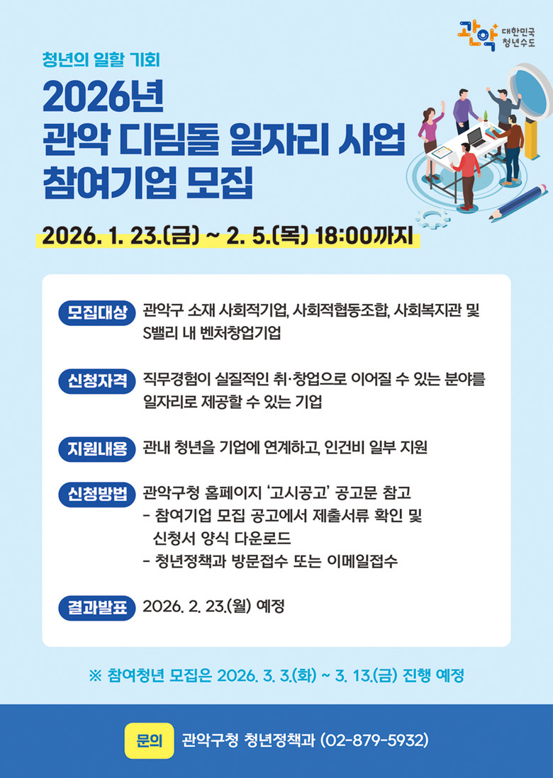 2026년 관악 디딤돌 일자리 사업에 대한 자세한 사항은 관악구청 청년정책과(☎02-879-5932)로 문의하면 된다.