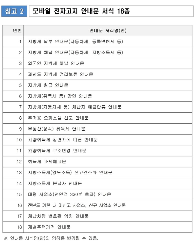 또한 안정적인 지방세 안내를 위해 수신자가 모바일 전자고지 안내문을 열람하지 않을 경우, 기존 우편(종이) 방식 고지·안내문 발송도 병행한다.