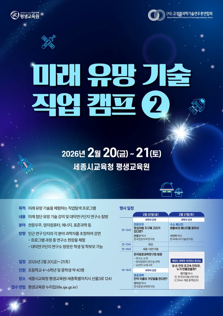 - 5일(목)부터 누리집 통해 접수 시작… 과학 꿈나무들의 직업 탐색 기회 제공 - [세종 세계타임즈=이채봉 기자] 세종특별자치시교육청평생교육원(원장 송정순, 이하 평생교육원 이도마루)은 지난 1월 청소년·시민들의 뜨거운 호응을 얻었던 ‘레전드 과학자 사이언스 토크쇼’와 ‘미래 유망 기술 진로 캠프’를 오는 2월, 더욱 풍성한 구성으로 확대 운영한다.