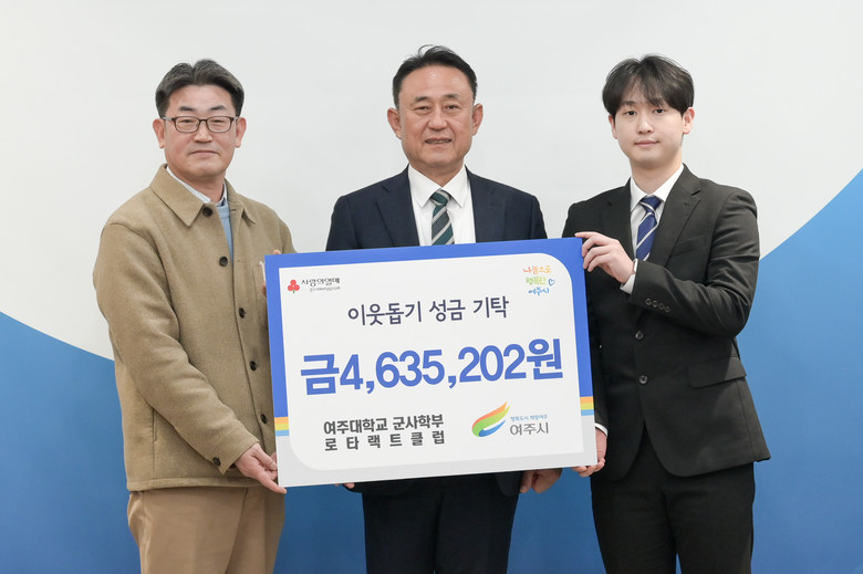 [여주시 세계타임즈=송민수 기자] 지난 23일 여주대학교 군사학부 로타랙트클럽(회장 장경록, 지도교수 한재우)에서는 여주시청(시장 이충우)을 방문하여 이웃돕기 성금 463만원을 기탁하였다.