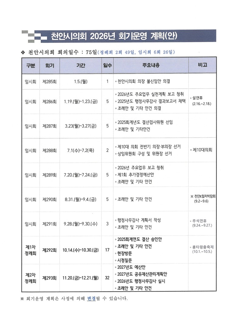 이번 제286회 임시회에서는 시정 현안과 시민 생활과 직결된 다양한 사안에 대해 심도 있는 논의가 이뤄질 예정이다. 특히 5분 발언을 통해 ▲천안시 세금 체납 관리의 완성을 위한 제언(이지원 의원) ▲천안시 복지 전달체계 전환을 위한 지역밀착형 사회복지관 도입 제안(유영진 의원) ▲품격 있는 국민의례, 애국충절의 도시 천안이 먼저 실천합시다(권오중 의원) ▲천안시 행정구 개편 및 명칭 재정립 제언(유수희 의원)을 통해 주요 현안에 대한 정책 대안이 제시될 계획이다.