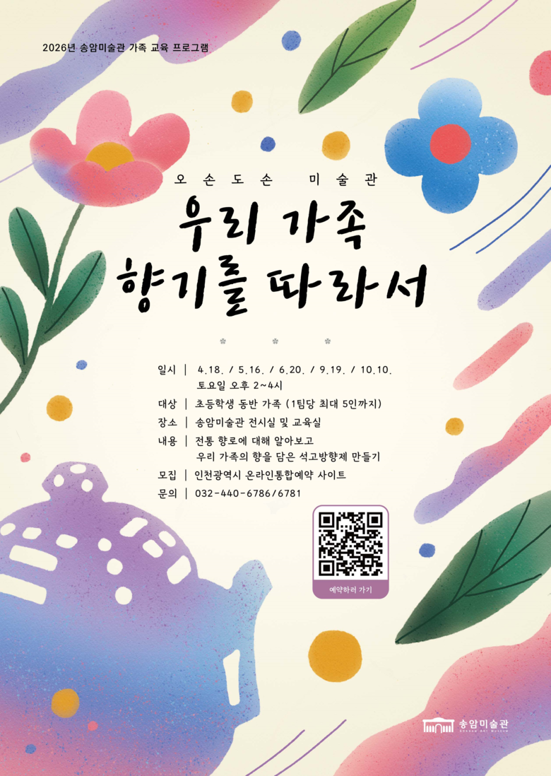 가족 단위 참여자를 위한 〈우리가족 향기를 따라서〉는 송암미술관 틈새전시와 연계해 전통 향로 문화를 살펴보는 프로그램이다. 전통 향로의 형태와 쓰임을 알아보고, 전시실에서 회화 작품을 감상하며 작품에서 떠오르는 향을 상상해보는 활동을 진행한다. 이어 가족만의 향기를 담은 석고 방향제 만들기 체험을 통해 감각적 경험을 확장할 수 있도록 구성됐다.