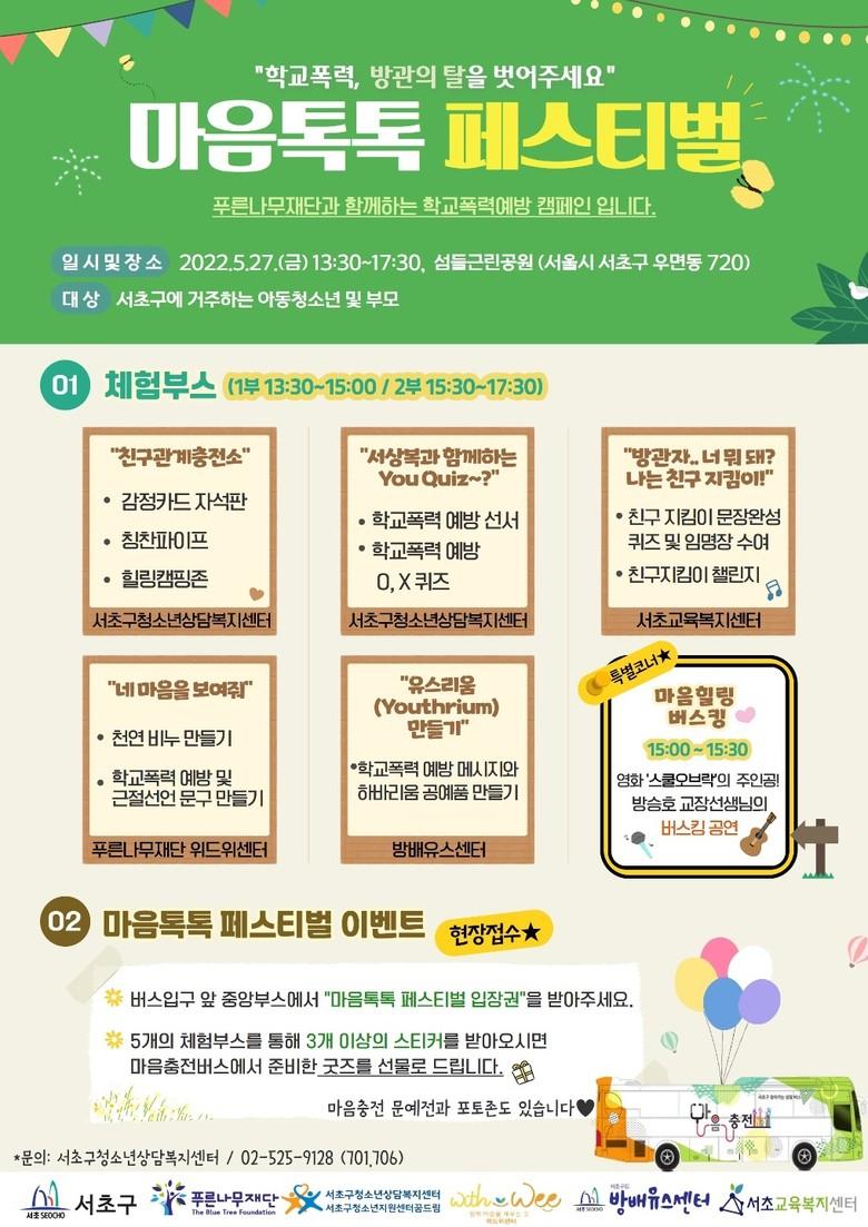 먼저 27일에는 ‘마음톡톡! 페스티벌’을 우면동 섬들 근린공원(서초구 태봉로2길 24)에서 연다.