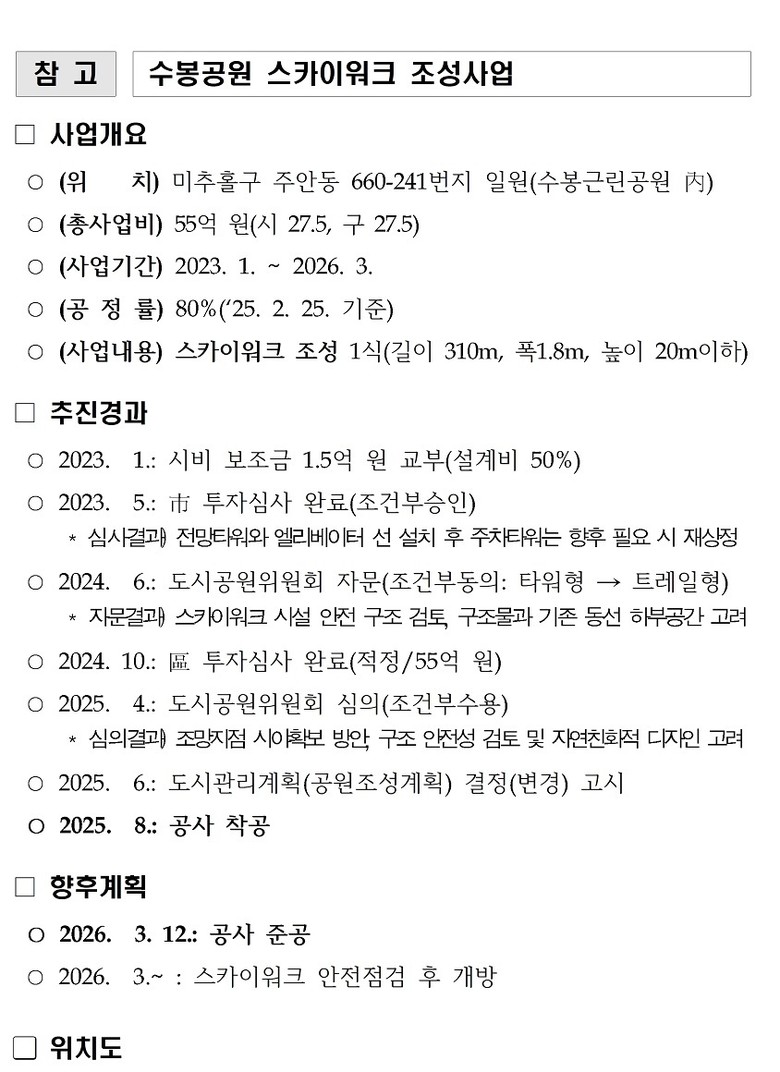 민선8기 10대 정책분야 공약사항 중 하나로 총 55억 원의 사업비가 투입됐다. 시는 스카이워크 조성을 통해 시민과의 약속을 이행하고 인천의 대표적인 원도심에 위치한 수봉공원의 가치를 한 단계 높이는 계기가 될 것으로 기대하고 있다.