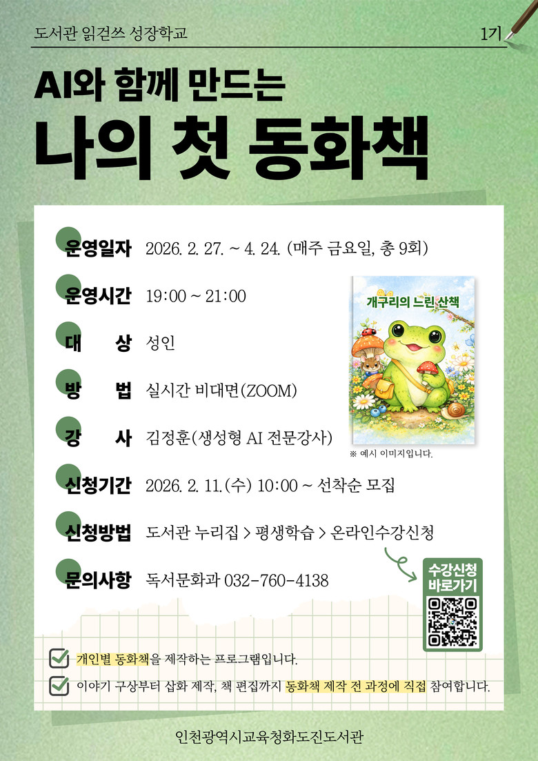 [인천 세계타임즈=심하린 기자] 인천광역시교육청화도진도서관(관장 한상철)은 오는 27일부터 성인 대상 2026년 읽걷쓰 성장학교 1기 ‘AI와 함께 만드는 나의 첫 동화책’ 프로그램을 운영한다.