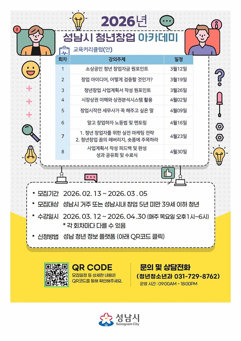 교육은 3월 12일부터 4월 30일까지 성남시 공공공간(수정구 수정남로 85 신흥7공영주차장 건물 내)에서 8회 과정(총 30시간)으로 운영된다.
