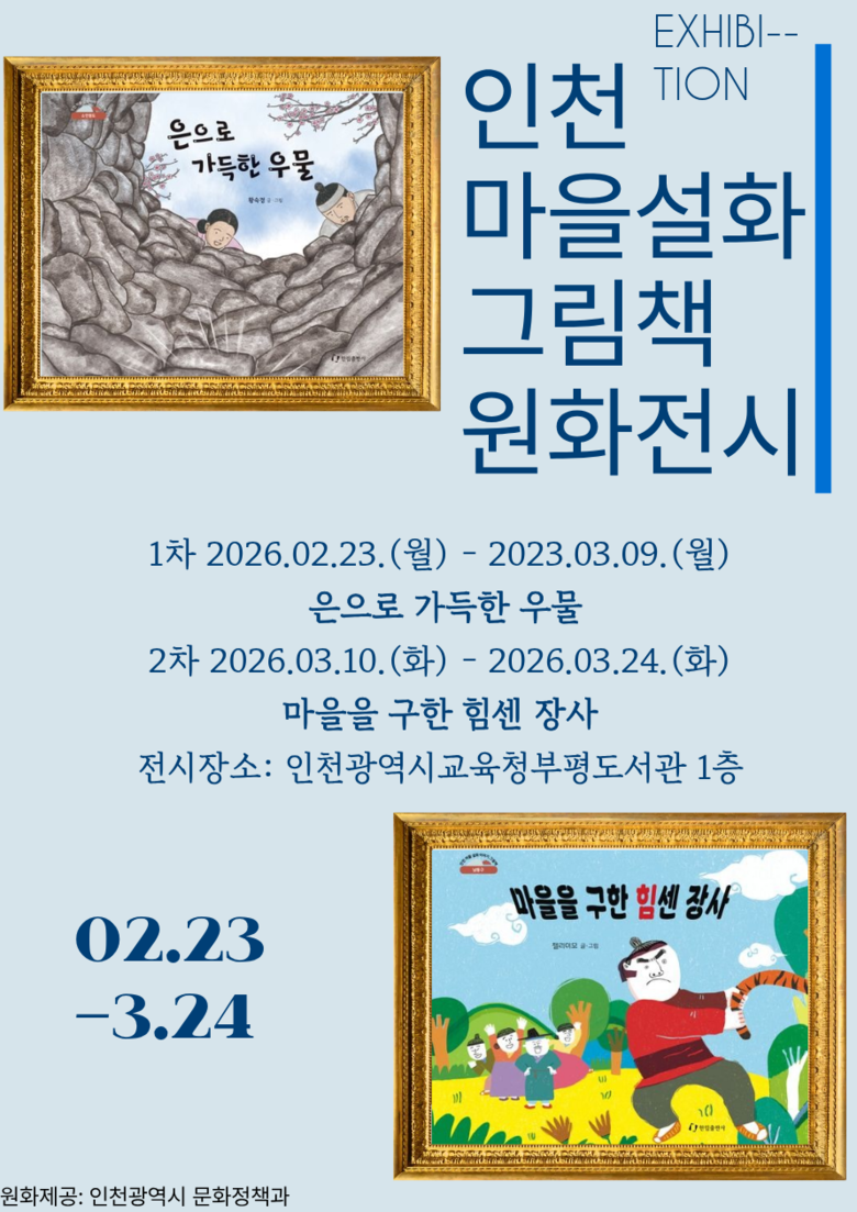 이번 전시에서는 지난해 인천광역시에서 제작한 마을설화 그림책 중 ‘은으로 가득한 우물’과 ‘마을을 구한 힘센 장사’ 두 작품의 원화 총 36점을 선보인다.