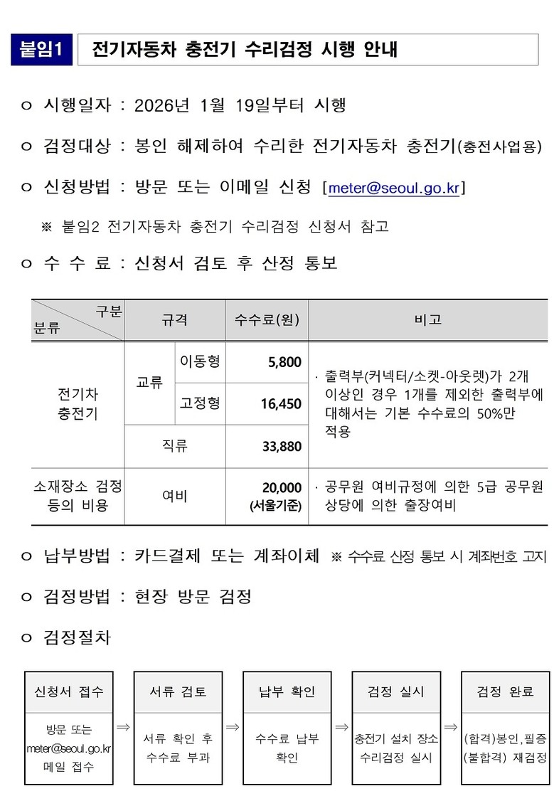 전기차 충전기 ‘수리검정’은 전기차 충전기의 계량 성능에 영향을 줄 수 있는 부분을 수리한 경우 계량값의 정확도를 검정하는 것으로, 산업통상부장관이 지정한 검정기관 및 지방자치단체가 수행할 수 있다. 검정기관은 주로 경기도에 소재하고 있으며, 지방자치단체 중에는 서울시가 최초로 시행한다.