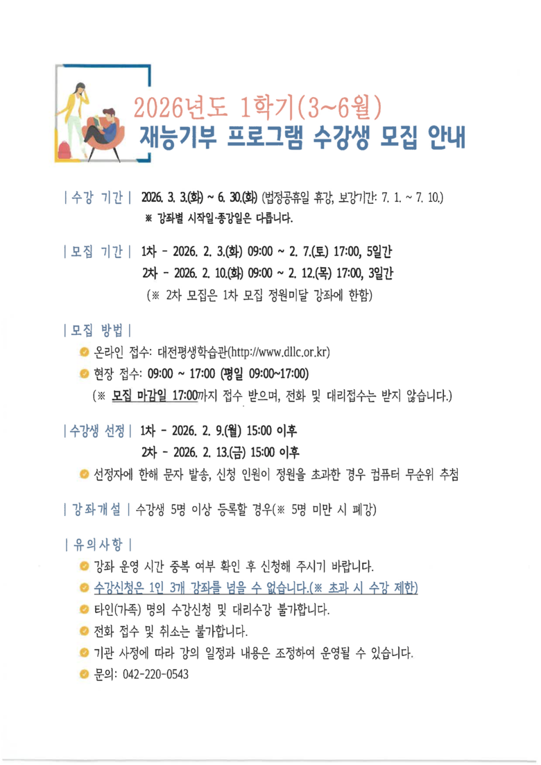 수강 신청은 2월 3일부터 7일까지 대전평생학습관 누리집에서 할 수 있다. 인터넷 이용이 어려운 어르신 등을 위해 평일 오전 9시부터 오후 5시까지 학습관 본관 101호에서 현장 접수도 병행한다.