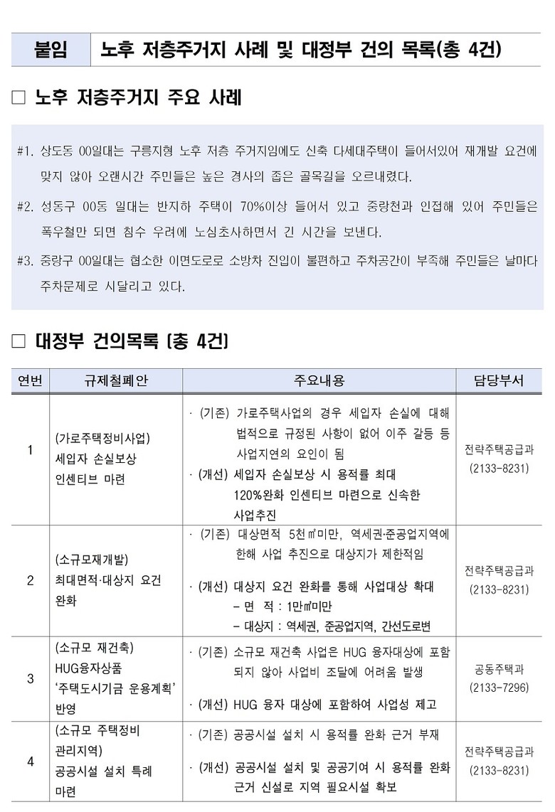 - 대상 확대, 융자지원 등 소규모재개발사업‧소규모재건축사업 활성화 방안 제도 건의