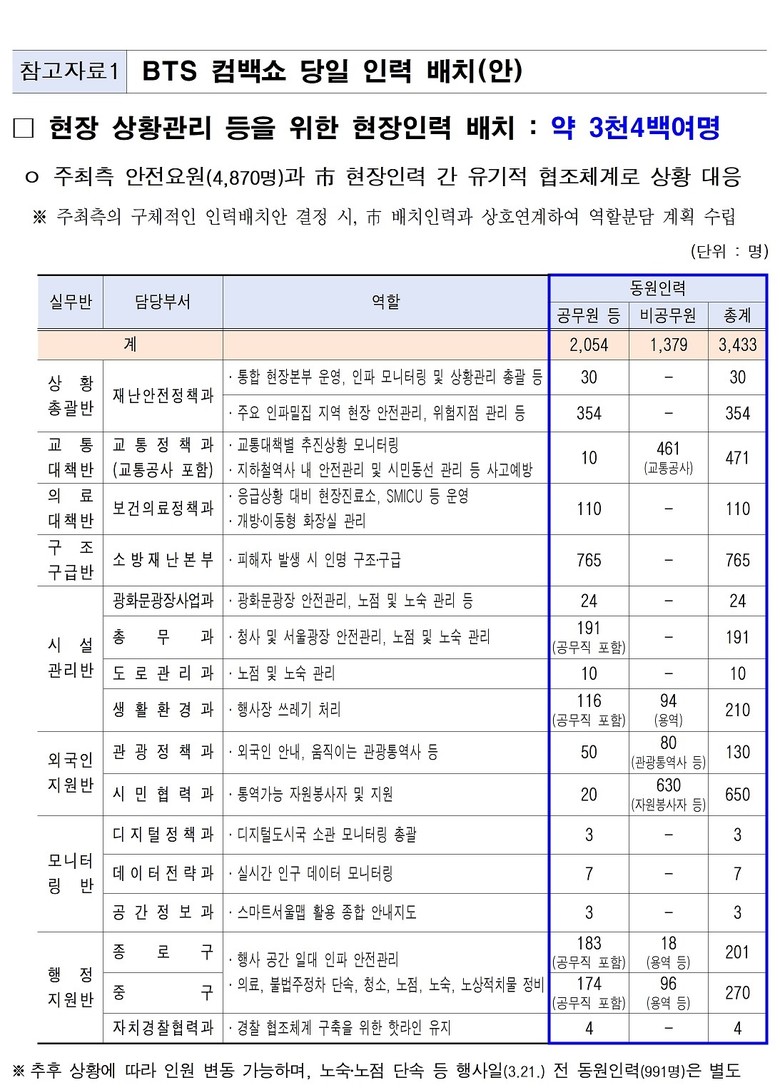 행사 당일 서울시는 안전을 최우선으로 하되, 전 세계 팬들과 시민들이 축제를 만끽할 수 있도록 관계기관과 총 3,400여 명 규모의 대응 인력을 현장에 투입해 관람객들의 안전과 질서를 확보했다. 주최 측 투입 인원을 합하면 8,200여 명의 안전 인력이 현장 지원에 나선 셈이다.