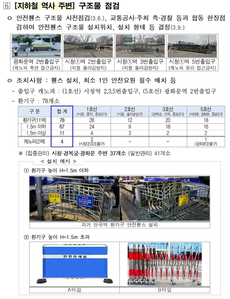 서울시는 지난 2월부터 행사장 주변 시설물, 공사장, 보‧차도, 맨홀 등에 대한 현장점검을 실시했고, 점검 결과 확인된 276건의 위험요소는 사전에 조치를 완료했다. 아울러 지하철 환기구(78개)와 역사 출입구 캐노피(4개) 등 82개 지점에는 추락 방지 안전 펜스를 사전에 꼼꼼하게 설치한 결과 당일 현장에서 관련 사고가 단 1건도 발생하지 않았다.