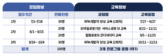 RPA 교육생 선발은 7월 18일(월)까지 지원 가능하며, 서류 및 면접평가를 거쳐 7월 중으로 최종 합격자를 발표할 예정이다.