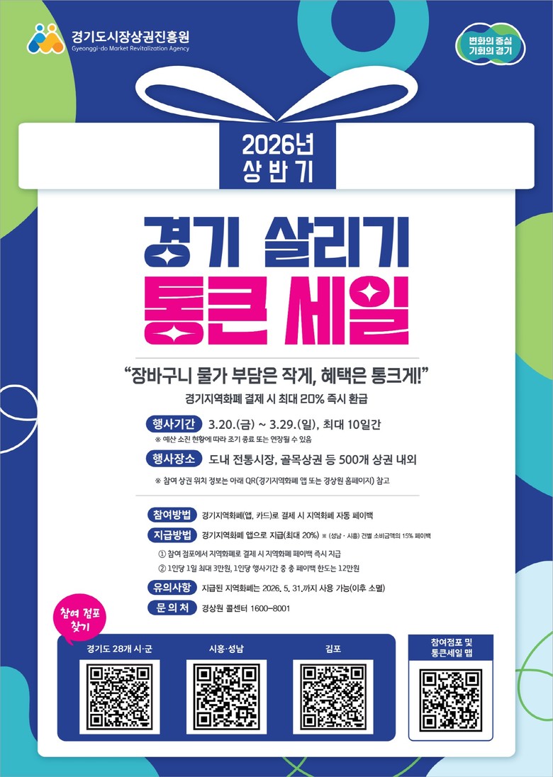 3월 20일부터 29일까지 10일간, 경기도와 경기도시장상권진흥원이 주관하는‘2026년 상반기 경기 살리기 통큰 세일’가 열려, 전통시장 및 골목상권을 중심으로 할인행사를 추진한다.