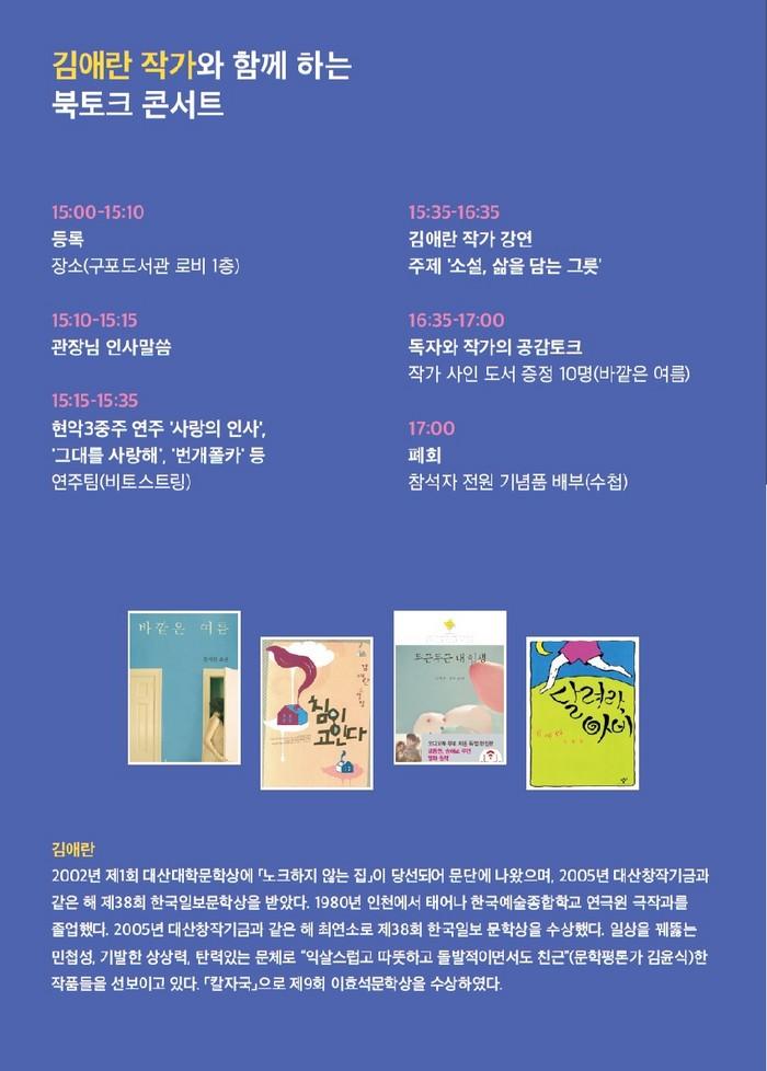 이 행사는 현악 3중주 연주, 작가 강연, 독자와 작가의 공감 토크 순으로 진행한다.