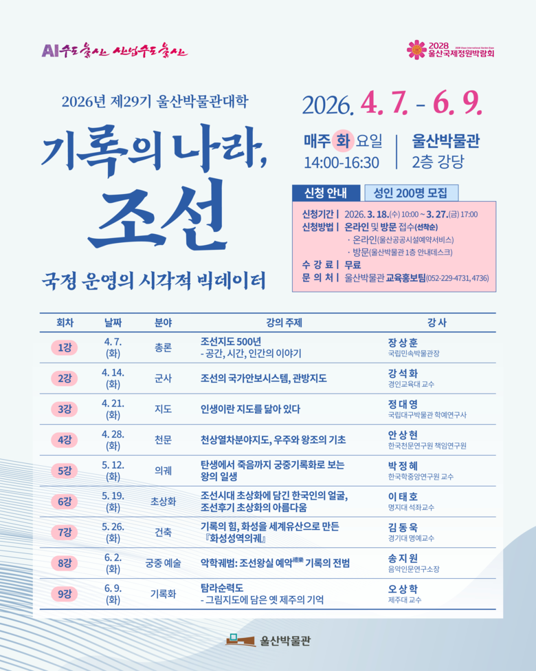 이번 학기는 ‘기록의 나라, 조선–국정 운영의 시각적 빅데이터’를 주제로 열린다. 울산이 추진하는 ‘인공지능(AI) 수도 울산’ 정책과 연계해 지도와 의궤 등 조선의 치밀한 기록 문화를 국정 운영의 빅데이터 관점에서 살펴보는 내용으로 구성됐다.