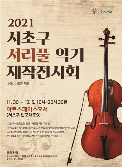 다음달 30일부터 12월 5일까지 개최되는 「서리풀 악기제작 전시회」는 코로나19로 타격을 입은 문화예술계 지역 상권에 활력을 불어넣고 코로나로 지친 주민들의 문화공연 향유 기회를 확대하고자 마련되었다.