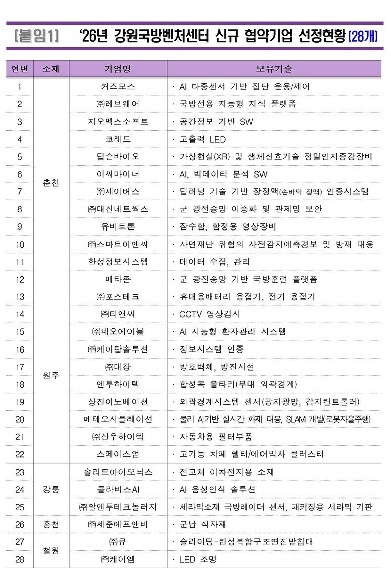 한편, 도는 오는 3월 9일 강원대학교 60주년기념관에서 김광래 경제부지사 주재로 「2026년 강원국방벤처센터 신규 협약기업 협약식」을 개최할 예정이다.