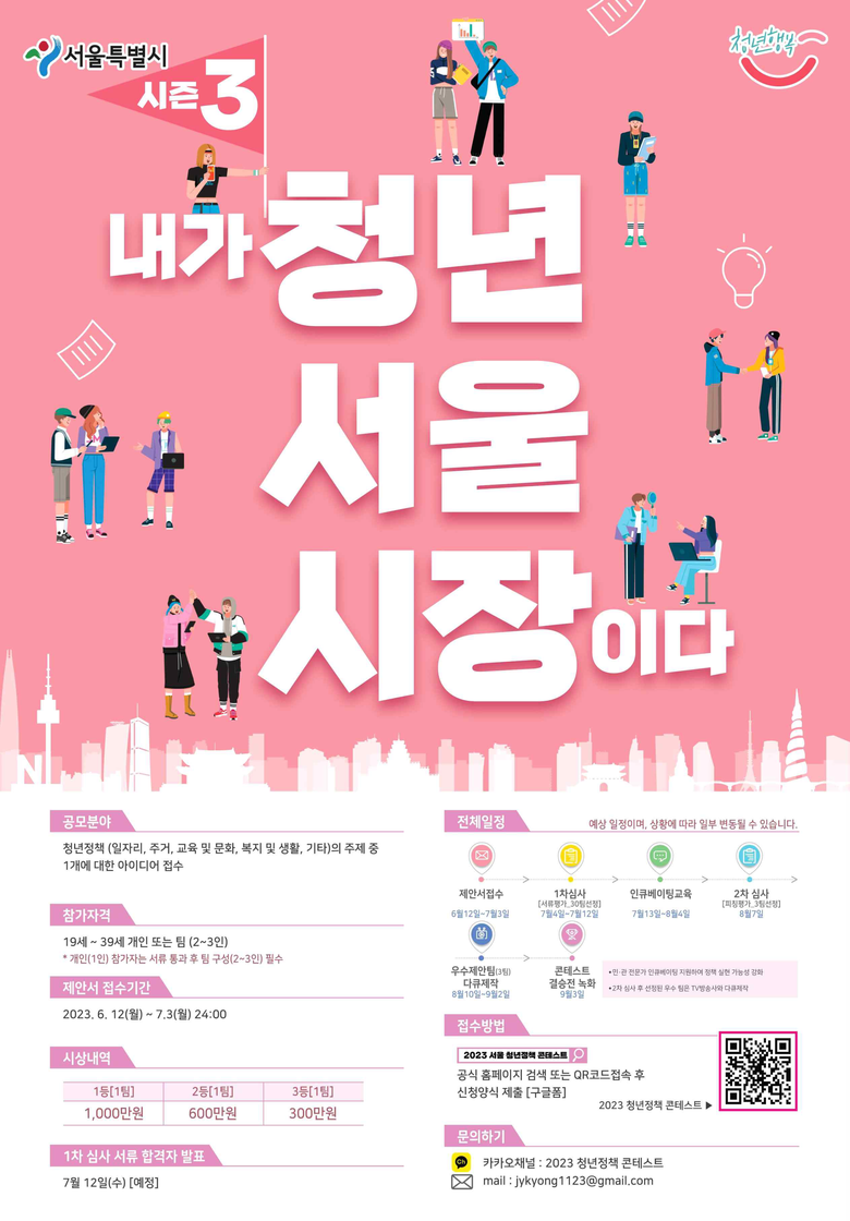 서울시가 2023년 청년정책 콘테스트 ‘내가 청년 서울시장이다’를 개최하고, 오는 6월 12일(월)부터 7월 3일(월)까지 약 3주간 참가자(팀)를 모집한다고 밝혔다. 전국의 만 19~39세 청년이라면 누구나 참여할 수 있다.