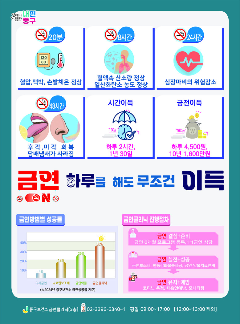 중구 금연클리닉을 이용하려면 중구 보건소 3층 금연클리닉에 방문 또는 전화(02-3396-6340~1)로 문의하면 된다.