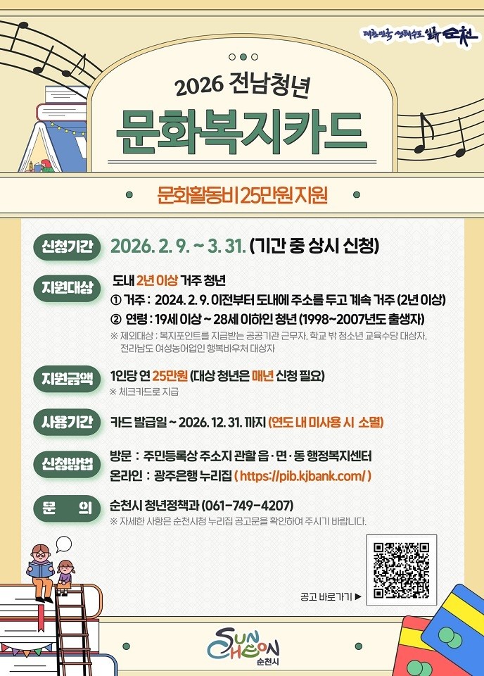 [순천시 세계타임즈=우덕현 기자] 순천시는 청년들의 문화생활 향유 및 자기계발 활동을 지원하기 위해 2026년 전남청년 문화복지카드 지원사업 대상자를 오는 3월 31일까지 모집한다.