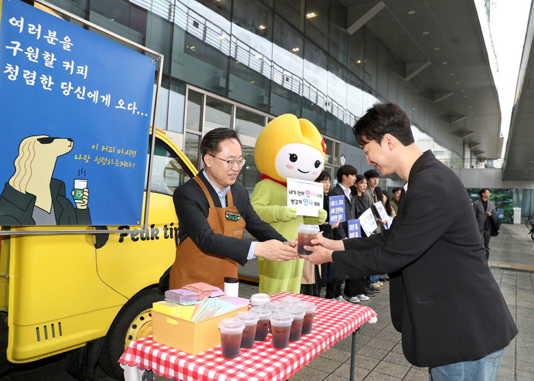 이날 아침 유성훈 금천구청장은 ‘금천 청렴 커피차’에서 1일 바리스타로 변신해 앞치마를 두르고 출근하는 직원들에게 직접 커피를 나눠주며 격려했다.