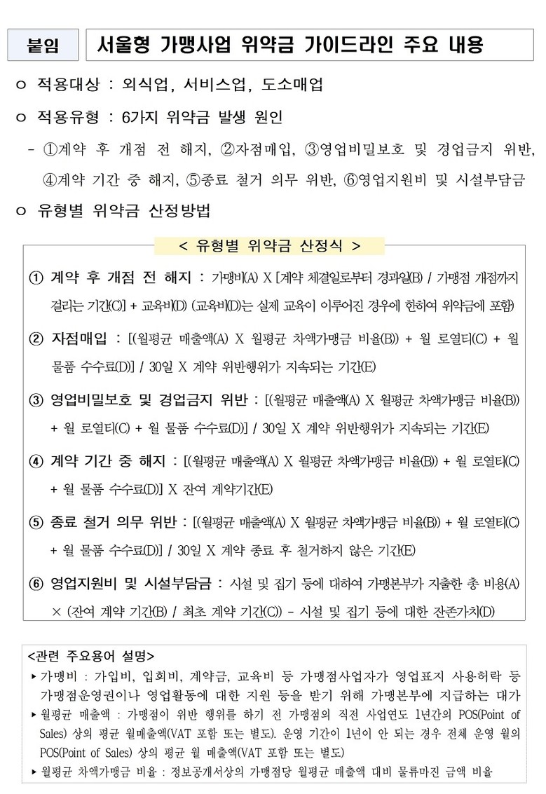 특히 분쟁이 잦은 ‘자점매입(지정 외 물품 구입)’의 경우, 단순히 횟수별 벌금을 부과하는 방식이 아니라 월평균 매출액, 차액가맹금 비율, 로열티, 물품수수료 등을 반영해 위반 기간에 따라 일할 계산하는 산식*을 예시로 제시했다. 이를 통해 가맹본부의 실제 손해와 점주의 이익을 함께 고려한 합리적인 기준을 마련했다.