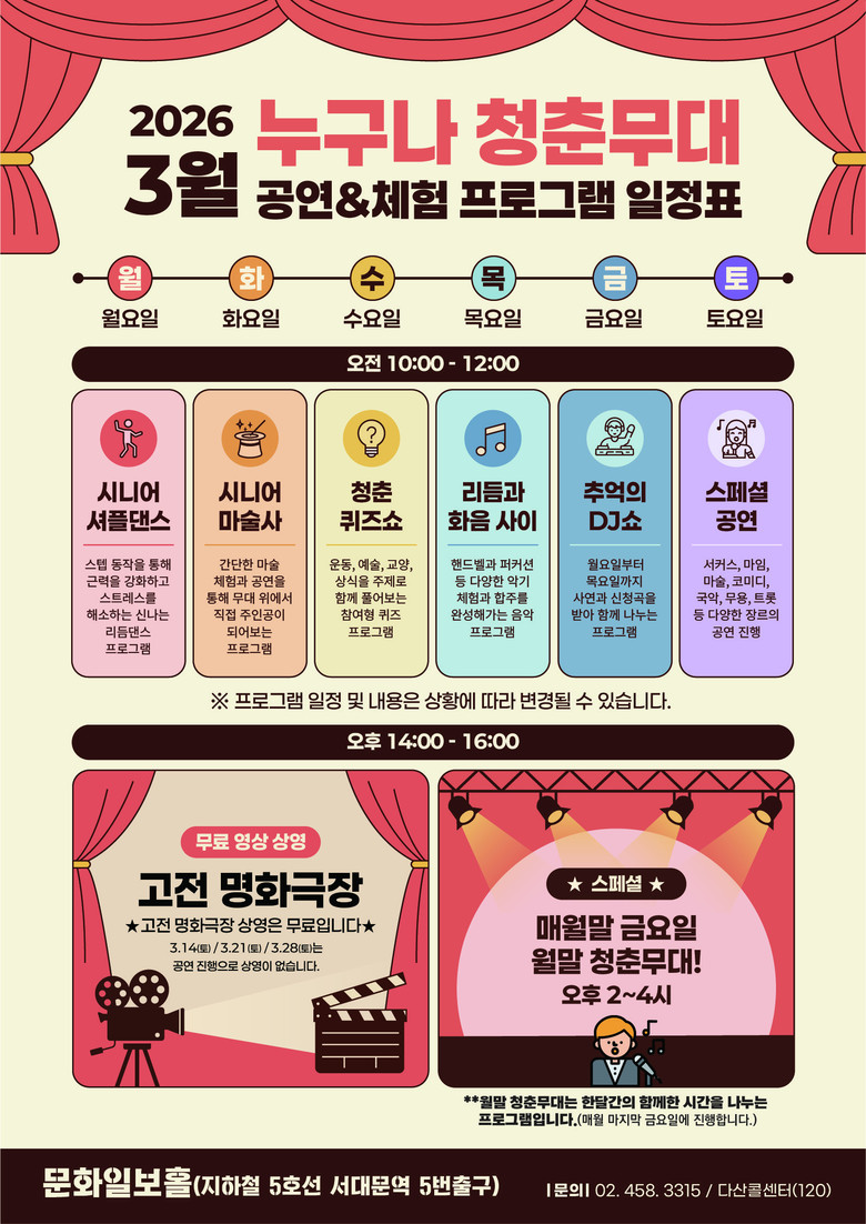 ‘누구나 청춘무대’는 오전(10~12시)에는 신체·정서·사회적 활력을 높이는 참여형 프로그램을 요일별로 운영하고, 오후(14시~)에는 고전 명화 상영뿐 아니라 다큐멘터리, 단편 드라마 등 다양한 영상 콘텐츠와 공연을 선보일 예정이다.