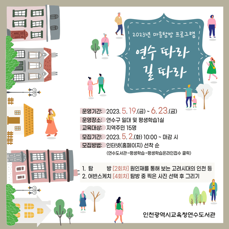 [인천 세계타임즈=심하린 기자] 인천광역시교육청연수도서관(관장 이인우)은 올해 마을 탐방 프로그램 ‘연수 따라 길 따라’ 강좌를 5월 19일부터 6월 23일까지 매주 금요일 오전 10시부터 두 시간 동안 대면으로 운영한다.
