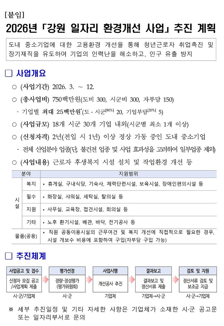 [강원도 세계타임즈=김민석 기자] 강원특별자치도(도지사 김진태)는 도내 중소기업 근로자의 직장 만족도를 높이고 지역 고용환경을 개선하기 위해 「강원 일자리 환경개선 사업」을 추진한다.