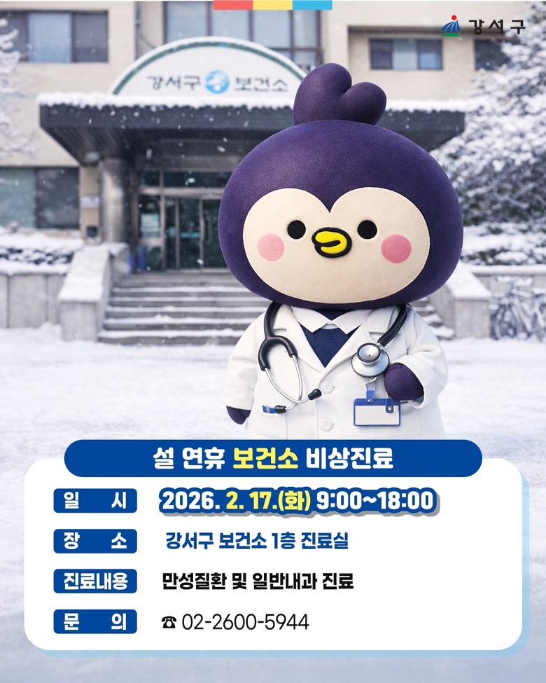 아울러, 17일(화) 명절 당일엔 강서구보건소(공항대로 651)가 오전 9시부터 오후 6시까지 ‘비상 진료’를 실시한다. 만성질환 및 일반 내과 진료가 필요한 구민을 위해, 의사 1명과 간호사 1명 등 비상 인력들이 근무한다.