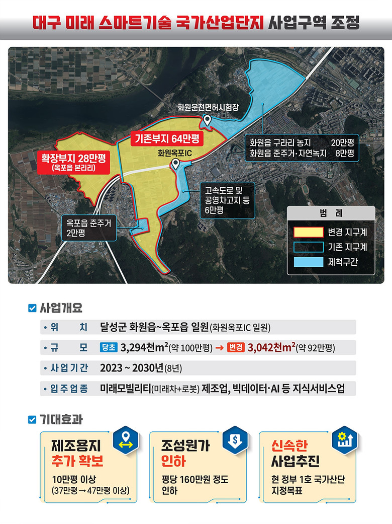 올해 3월 15일 달성군 화원읍~옥포읍 일원 3,294천㎡(약 100만 평) 규모 제2국가산단 후보지 선정 이후 대구광역시와 사업시행예정자(LH, 대구도시개발공사)는 우수한 역외기업 유치를 위해서 조성원가 인하 방안 마련과 제조용지 추가 확보가 필요하다고 판단하고 사업구역 조정 방안을 지속적으로 논의해 왔다.