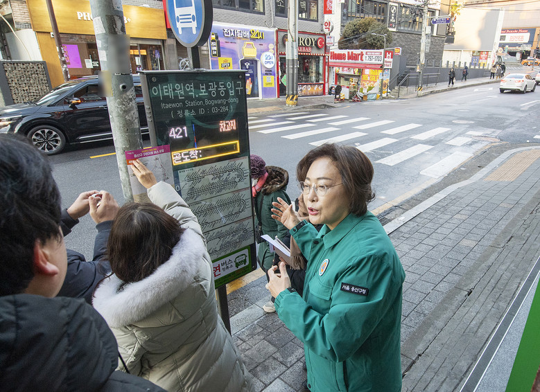 ▲ 박희영 용산구청장이 이태원역 인근 버스정류장을 방문해 구민지원버스 노선표 부착 상태 등을 점검하고 구민들에게 버스 이용에 대해 안내하고 있다.