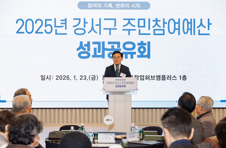 [강서구 세계타임즈=이장성 기자] 서울 강서구(구청장 진교훈)는 지난 23일(금) 서울창업허브 엠플러스(마곡중앙8로 14)에서 주민참여예산위원회 및 각 동 주민자치회장 50여 명이 참석한 가운데 ‘2025년 강서구 주민참여예산 성과공유회’를 개최했다.