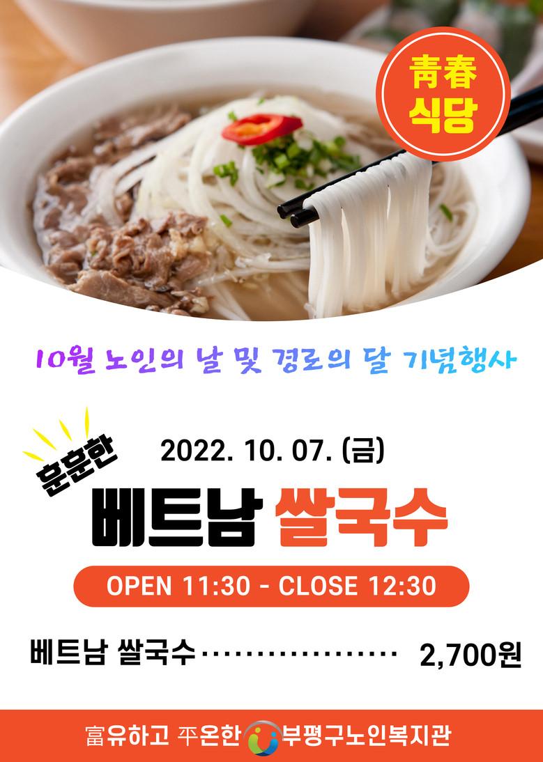 [부평구 세계타임즈=김광수 기자] 부평구노인복지관(관장: 최민수)은 10월 노인의 날 및 경로의 달을 기념하여 靑春식당을 이용하는 어르신에게 베트남의 대표적인 음식 쌀국수를 전문 쉐프가 직접 만들어 제공하는 이벤트를 실시한다고 밝혔다.