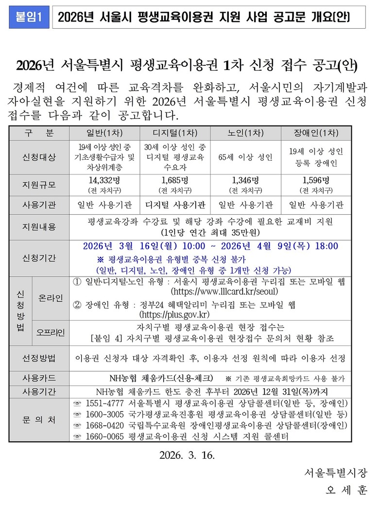 서울시는 16일(월) 오전 10시부터 다음 달 9일(목) 18시까지 ‘2026년 평생교육이용권’ 지원을 받을 시민들을 모집한다고 밝혔다.