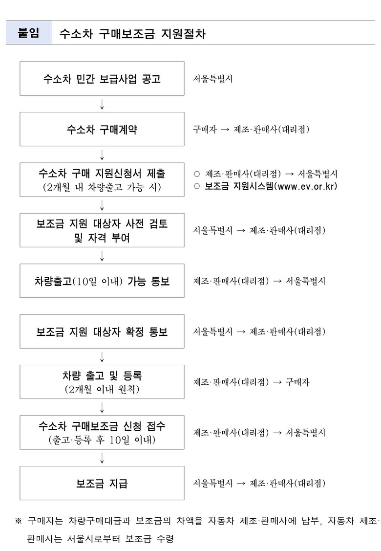 수소차 보조금 관련 자세한 사항은 ☎120다산콜센터로 문의할 수 있으며 서울시 누리집(www.seoul.go.kr), 환경부 무공해차 통합 누리집(ev.or.kr) 등에서도 확인할 수 있다.