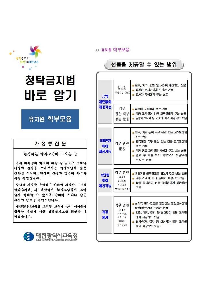 대전교육청 류춘열 감사관은 “학부모와 교직원이 이번에 안내해 드리는 「청탁금지법 바로 알기」와 「청탁금지법 시행령」 개정 내용에 대해 올바르게 이해하고 실천하는 계기가 되길 바란다”고 말했다.